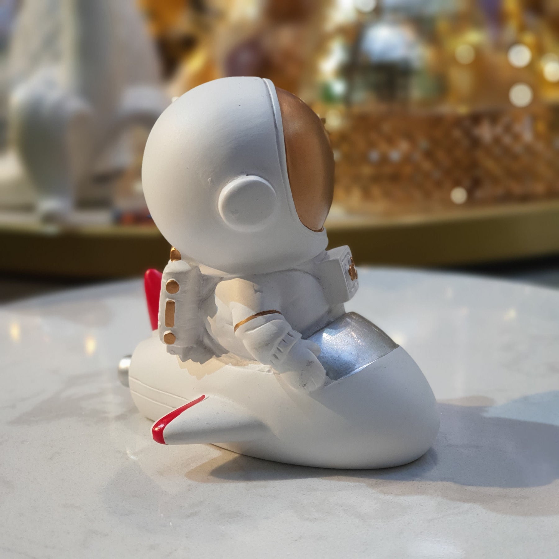 Preparado para despegar 🚁. Nuestro astronauta de resina se encuentra sobre su cohete, listo para explorar nuevos mundos 🌠. Detalle dinámico y emocionante. Este diseño es ideal para aquellos que buscan un elemento decorativo que transmita acción, aventura y exploración. ¡Será un gran añadido a cualquier espacio!
