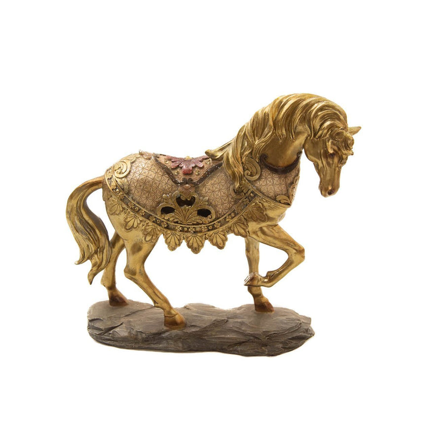 Este elegante caballo color dorado es el adorno perfecto para añadir un toque de sofisticación a tu decoración. Su acabado brillante y su diseño refinado lo convierten en una pieza única que destacará en cualquier rincón de tu hogar. ¡Una decoración dorada con mucho estilo!