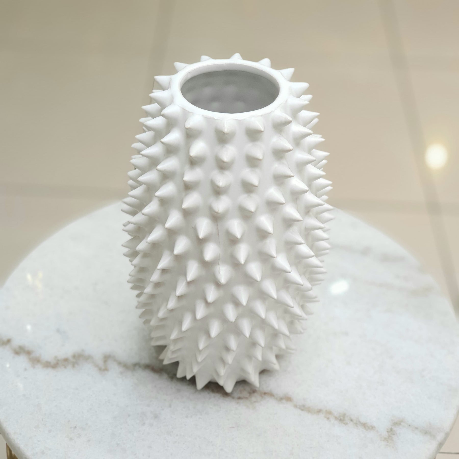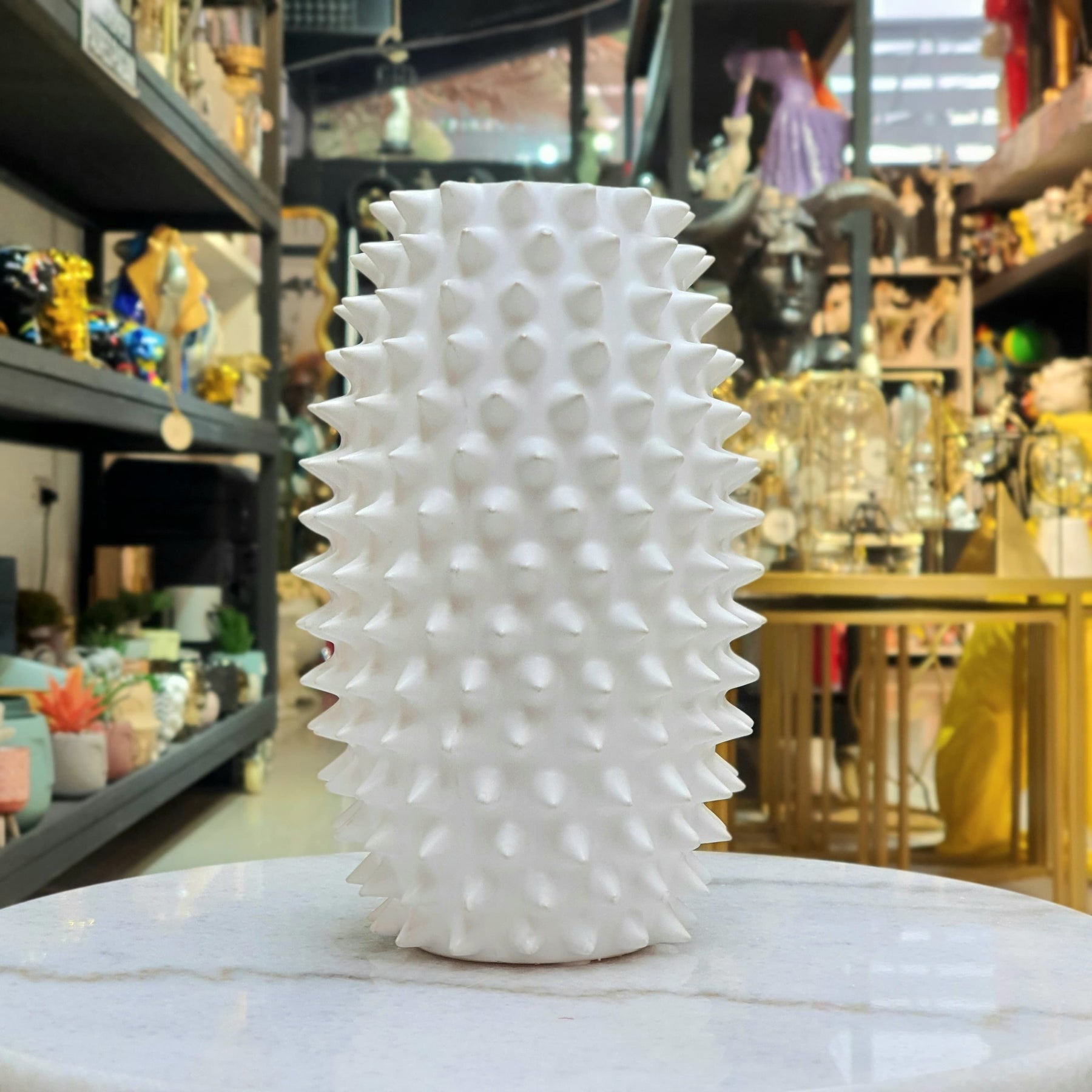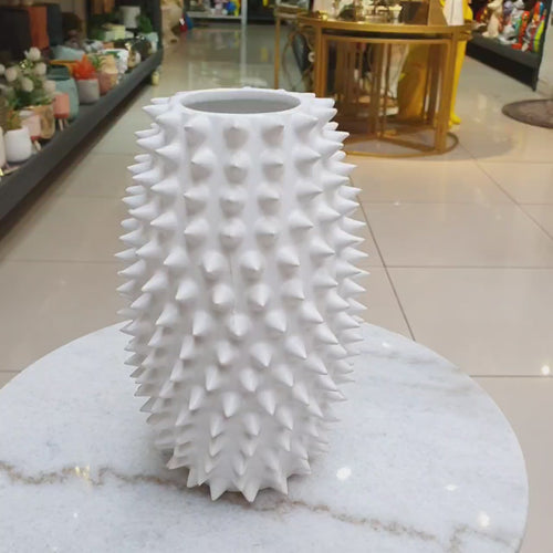Florero de cerámica con diseño texturizado de púas, ideal para interiores modernos.  Su estilo llamativo lo convierte en el centro de atención en salas, oficinas o estudios.  Pieza única para quienes buscan originalidad y carácter.