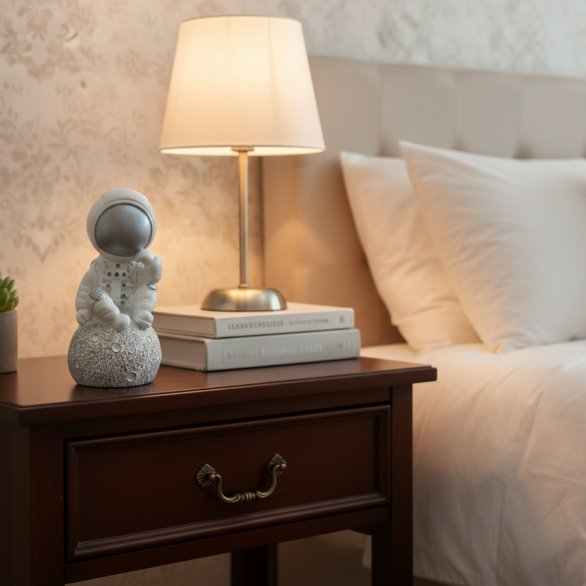 Detalle minimalista y color blanco con plateado. Añade un toque de glamour y emoción espacial 😍. Perfecto para escritorios, estanterías o mesas de noche.
