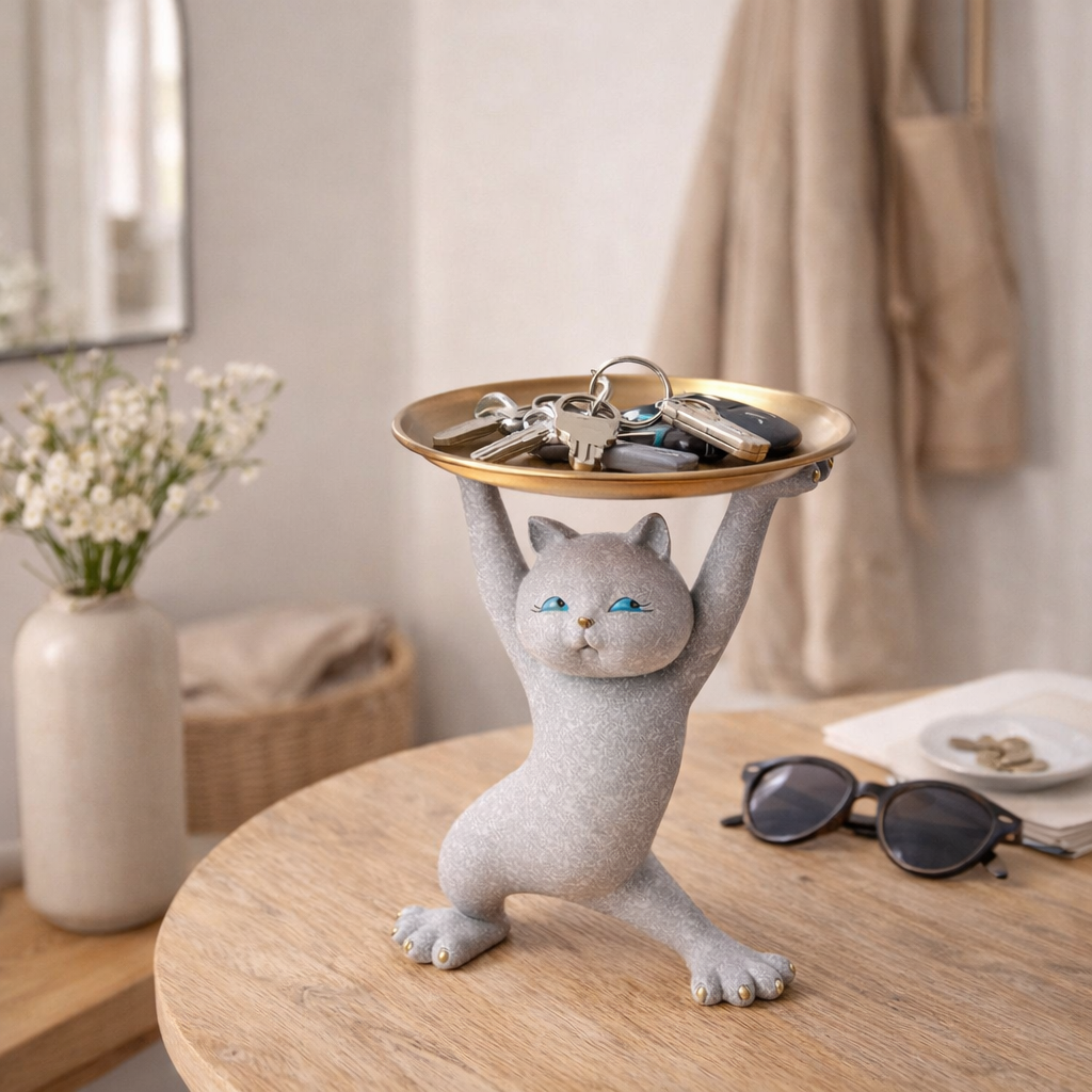 Un gato erguido con una bandeja, tallado en resina de alta calidad. Perfecto para: