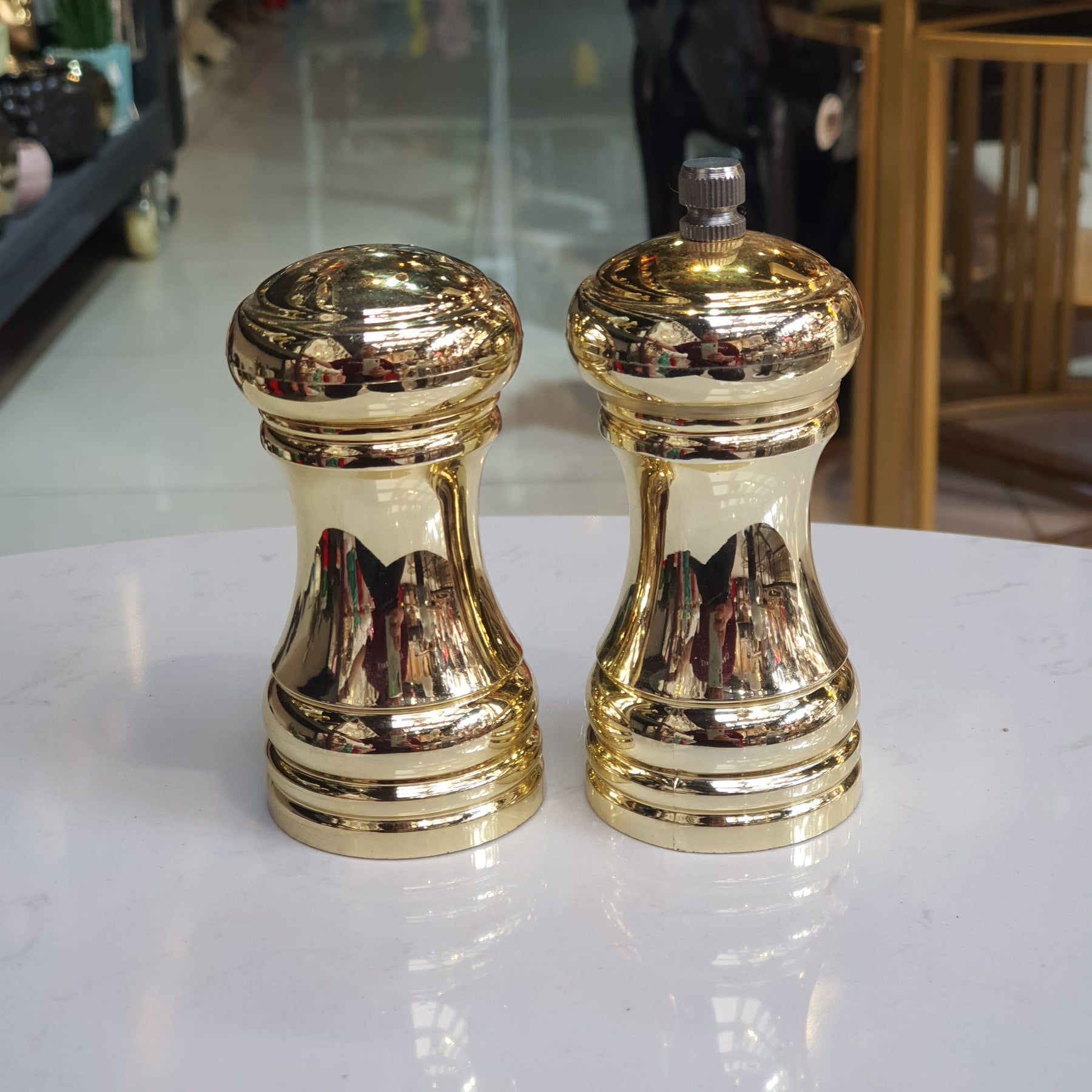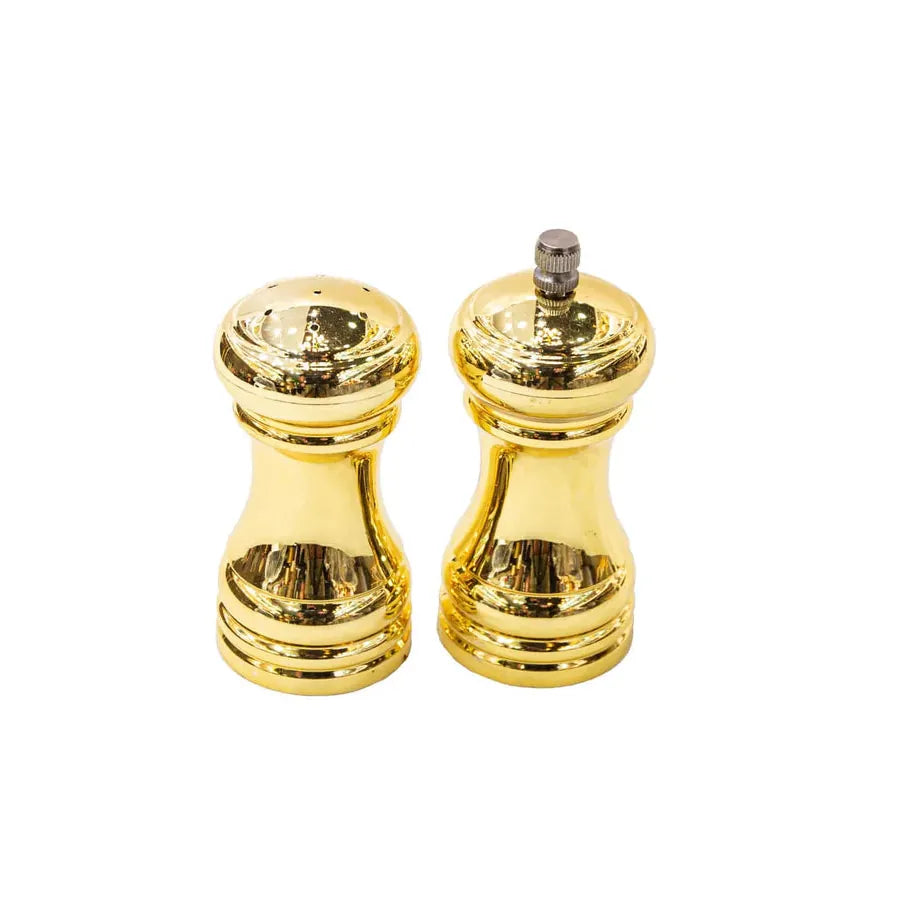 Set de salero y pimentero en acabado color dorado combina funcionalidad y estilo. Con un diseño ergonómico y sofisticado, es ideal para realzar cualquier mesa o cocina moderna. El molinillo ajustable permite personalizar la molienda, mientras que el salero ofrece una distribución uniforme. Perfecto para quienes buscan un toque de lujo en su experiencia gastronómica.