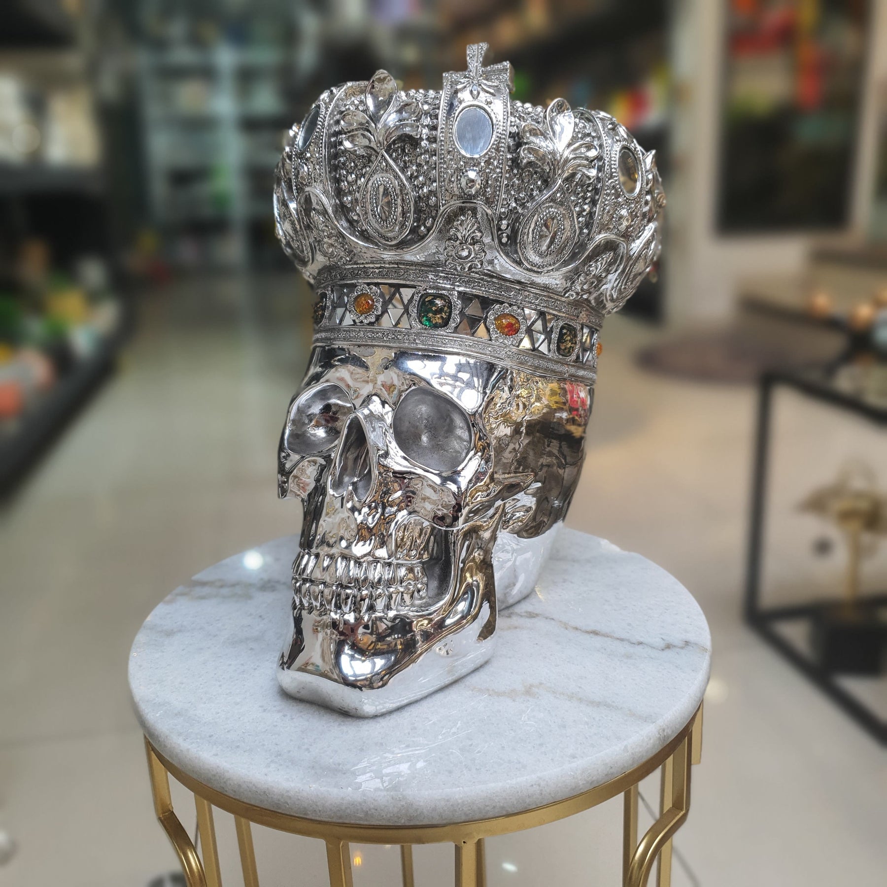 Escultura plateada de calavera con corona, elaborada con un acabado brillante que resalta su elegancia y misterio. La calavera refleja detalles precisos, mientras que la corona, está decorada con intrincados relieves y piedras decorativas. Ideal para ambientes modernos o temáticos, combina sofisticación y un toque oscuro, perfecto para destacar en cualquier espacio.