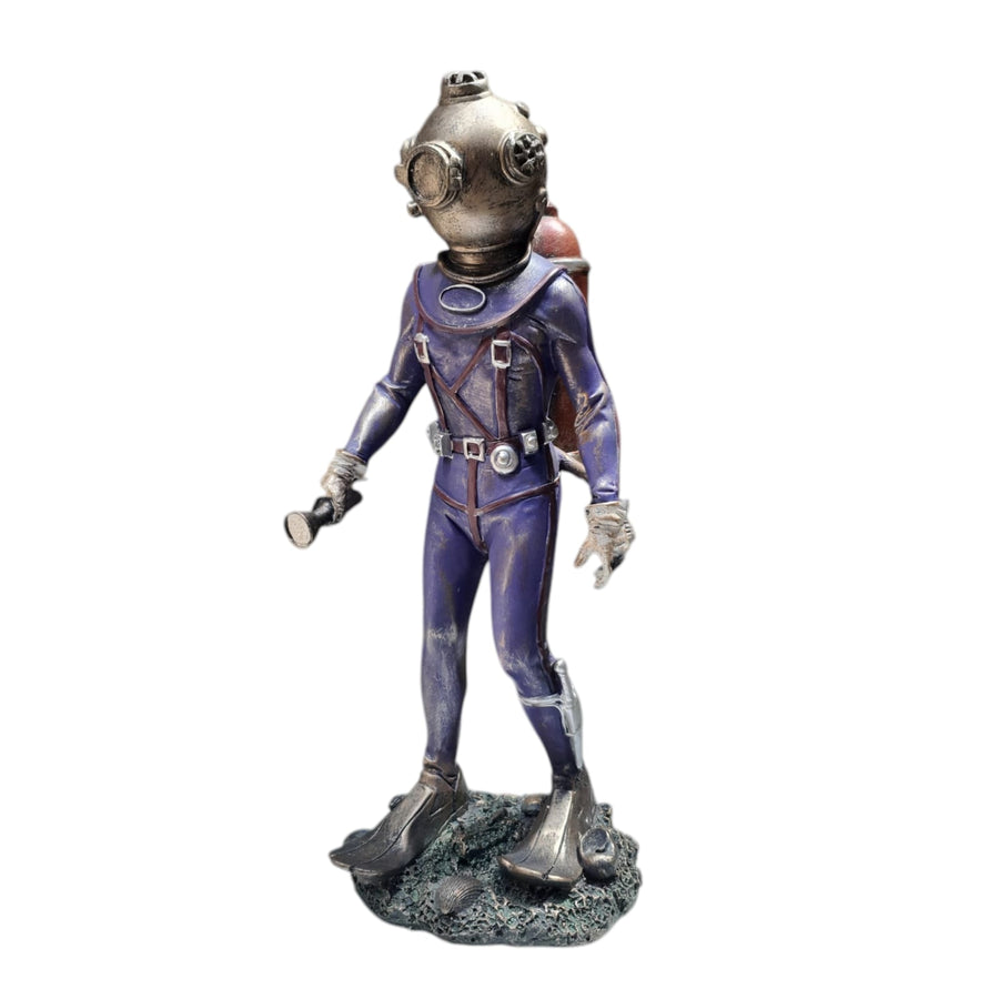 Figura decorativa inspirada en el estilo retro de los antiguos exploradores marinos. La escafandra detallada y el traje de buceo crean una sensación de aventura y misterio submarino. Perfecta para amantes del mar y la decoración temática, esta pieza única añade un toque de nostalgia y exploración a cualquier espacio, ideal para crear un ambiente original y cautivador.