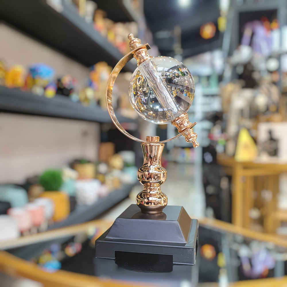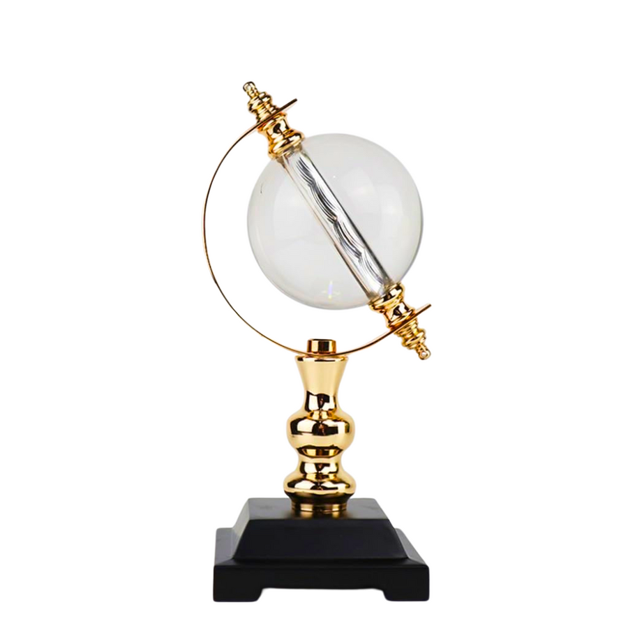Una esfera de cristal elegante y refinada, que resplandece con un brillo sutil, colocada sobre una base metálica negra de diseño minimalista. La superficie de la esfera es lisa y translúcida, permitiendo que la luz juegue con su forma esférica, mientras que la base metálica proporciona un contraste sobrio y moderno, destacando la belleza de la pieza sin restarle protagonismo. Ideal para agregar un toque de sofisticación y modernidad a cualquier espacio.