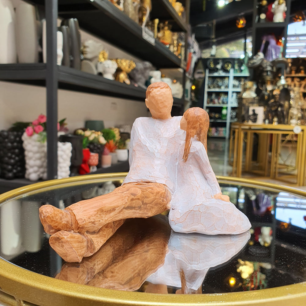 Escultura minimalista que representa el vínculo especial entre un padre y su hija, capturando un momento de tranquilidad y cercanía. Elaborada en resina con acabados texturizados en tonos cálidos, ideal para decorar salas, dormitorios, oficinas o espacios familiares. Su diseño emotivo y simbólico la convierte en un regalo perfecto para celebrar el amor y la conexión entre padres e hijos.