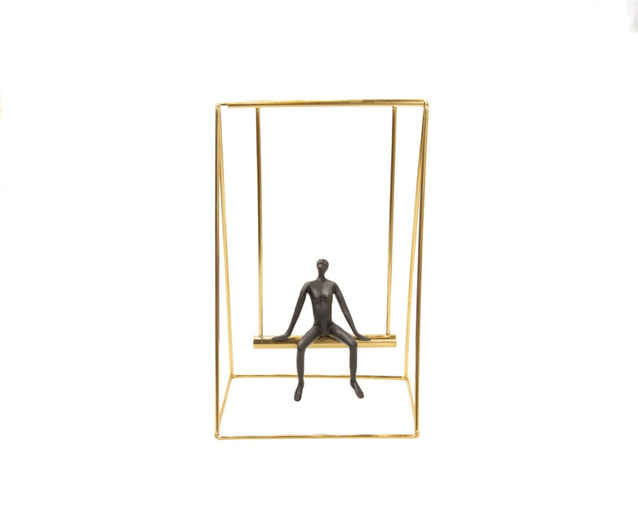Escultura contemporánea que representa a un hombre sentado en un columpio, evocando tranquilidad y contemplación. Esta pieza es ideal para añadir un toque de serenidad a cualquier espacio. Perfecta para decorar salas, oficinas o rincones especiales, combinando arte y significado en un estilo moderno y distintivo.