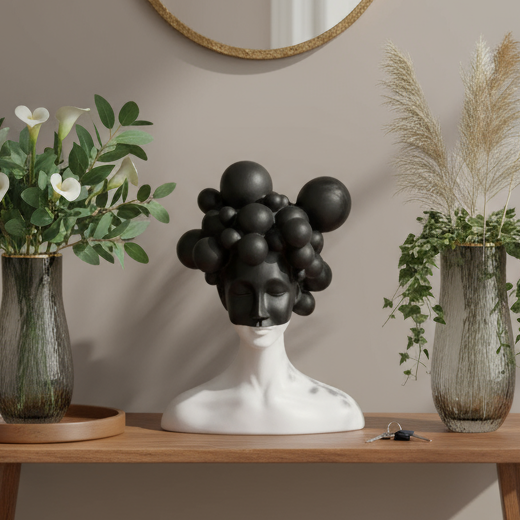 Escultura decorativa que juega con formas fluidas y curvas estilizadas, representando feminidad y gracia sin detalles realistas. Con líneas suaves y dinámicas, la figura sugiere movimiento y elegancia, fusionando elementos orgánicos con toques geométricos. Su diseño contemporáneo aporta sofisticación a cualquier espacio, evocando belleza y serenidad a través de una interpretación artística minimalista. Ideal para ambientes modernos.