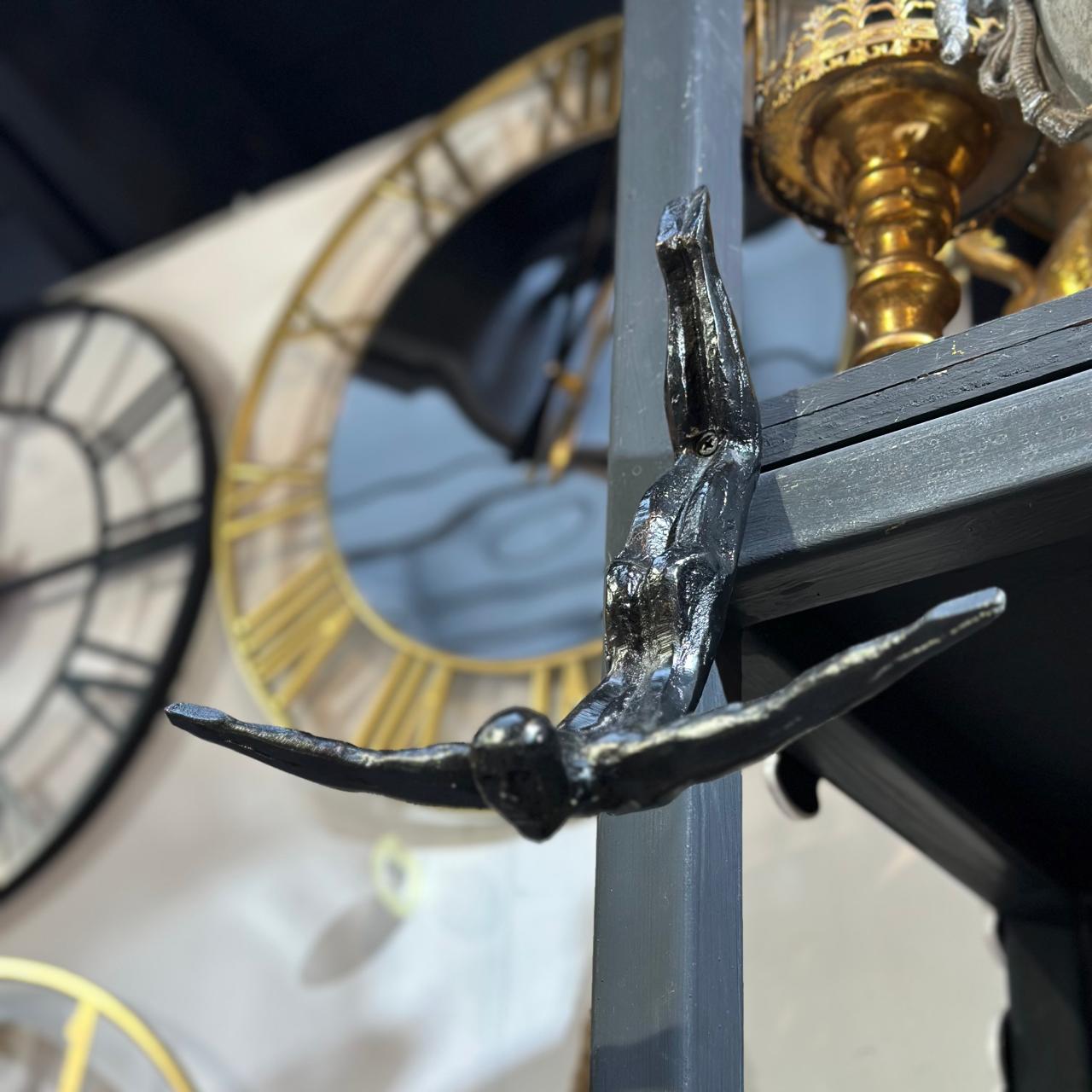 Escultura de acróbata en hierro, diseñada para colocar en pared. Ideal para dar un toque artístico, moderno y dinámico a salas, estudios o pasillos con personalidad.