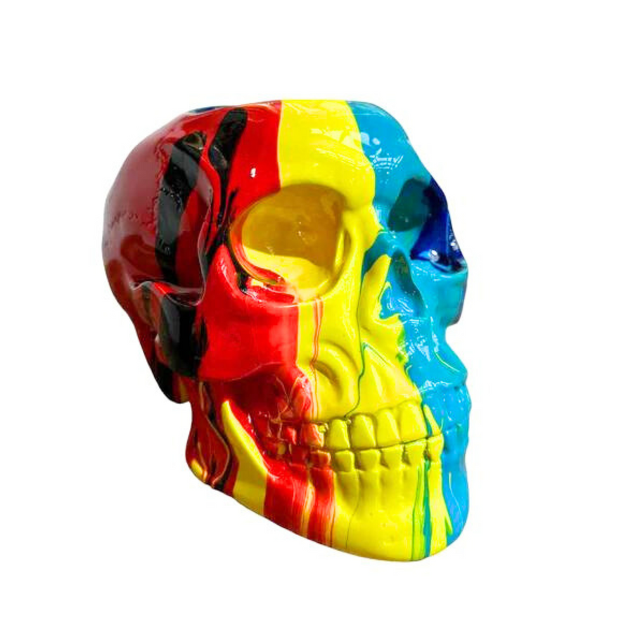 Escultura de calavera en colores vibrantes, con un diseño moderno y artístico.  Ideal para quienes buscan una pieza decorativa única, que combine energía, color y estilo contemporáneo, perfecta para destacar en cualquier espacio moderno o art.