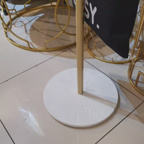 "Perchero de hierro con Base de Mármol: Lujo y elegancia en un solo diseño.  La combinación de la estructura de fierro resistente con la base de mármol noble, crea un perchero único y sofisticado.  El mármol añade un toque de glamour y elegancia, mientras que el fierro dorado proporciona una sensación de robustez y durabilidad.