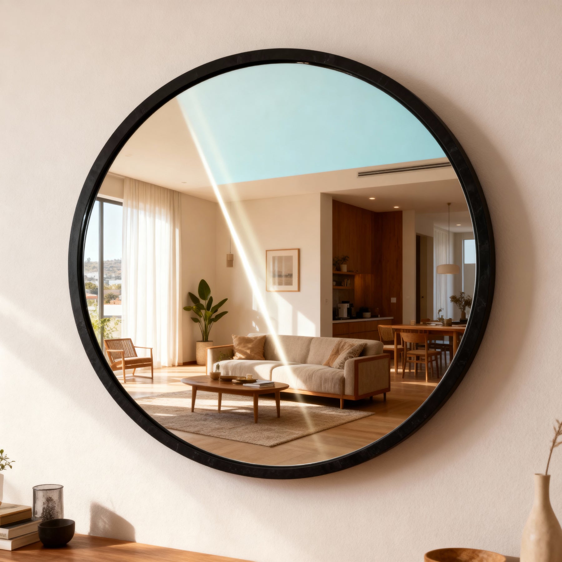 Nuestro espejo de pared circular con borde de polímero color negro es una pieza lujosa y elegante que agregará un toque de sofisticación a cualquier habitación.  El diseño circular es clásico y eterno, mientras que el borde de polímero color negro proporciona un brillo y una elegancia adicional.