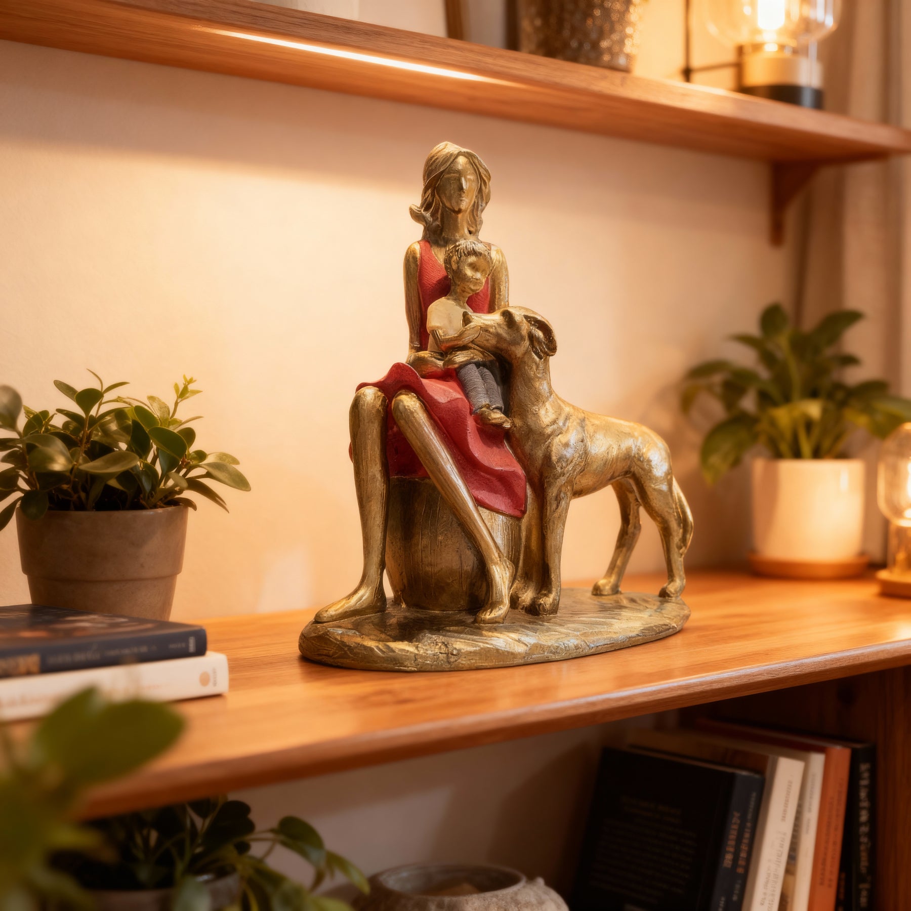 Un abrazo lleno de amor. Mujer, hijo y perro unidos en un momento de ternura.  La mujer sonríe con cariño, rodeando con su brazo al niño, que sonríe con inocencia.  El perro mira con lealtad y cariño.  Un símbolo conmovedor de la unión familiar. Transmite calidez, armonía y felicidad. Un regalo emotivo para aquellos que valoran el amor y la familia.