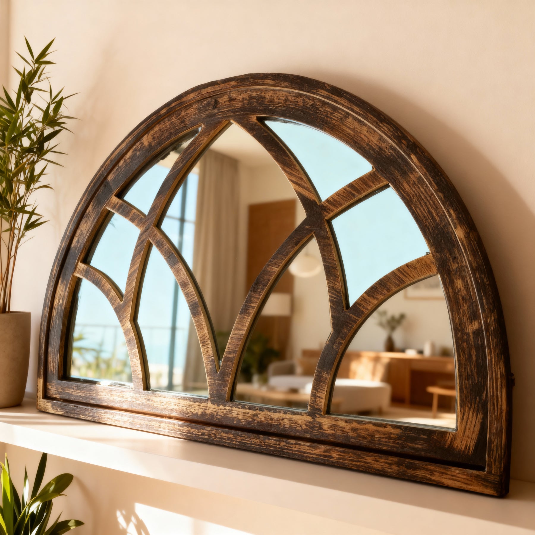 Nuestro espejo de pared en forma de cúpula con borde de polímero color bronce es una creación exclusiva y lujosa que agregar un toque de sofisticación a cualquier habitación. La forma de cúpula es una declaración de estilo, mientras que el borde de polímero color bronce proporciona un brillo y una elegancia adicionales.