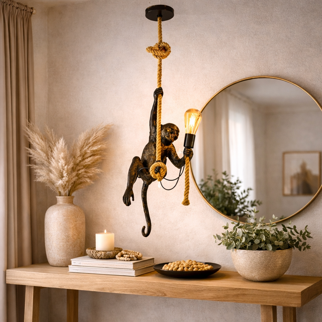 Lámpara de techo con forma de mono, un diseño divertido y original. Representa a un mono colgando, sosteniendo la bombilla, lo que añade un toque aventurero a la decoración. Ideal para espacios modernos o temáticos, combina funcionalidad y estilo, creando un punto focal llamativo y lleno de personalidad. Perfecta para quienes buscan algo único y creativo en su hogar.